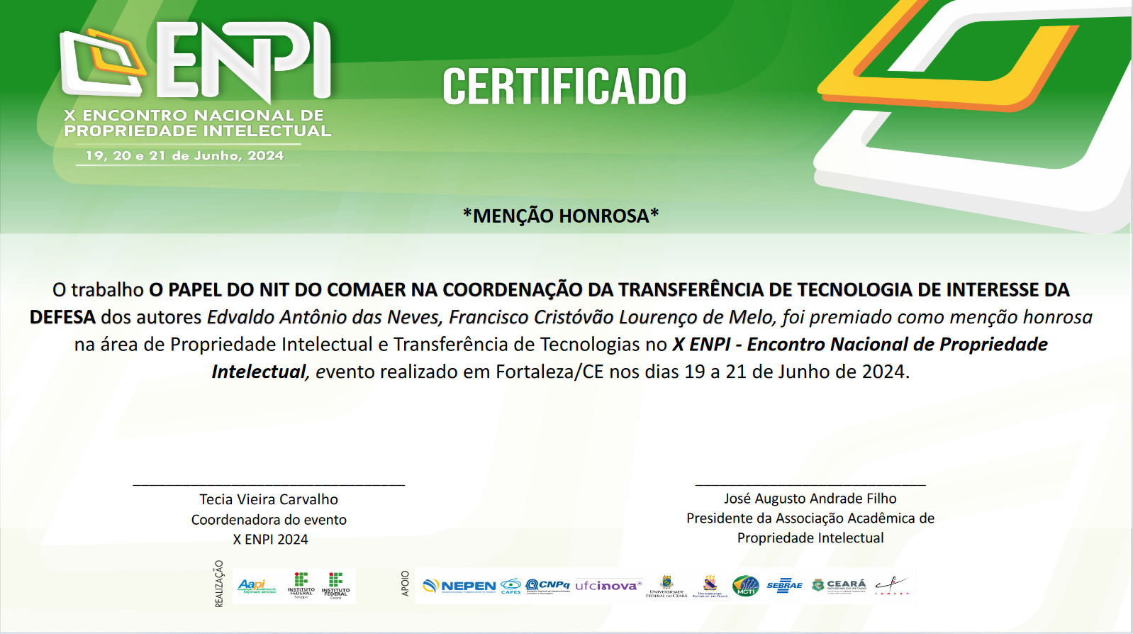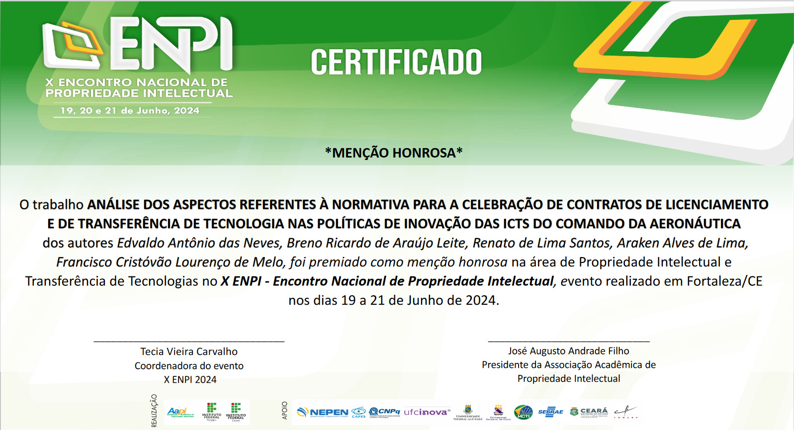 Discente e Egresso do PG-CTE - área de Gestão Tecnológica - receberam menções honrosas no X ENPI - Encontro Nacional de Propriedade Intelectual, realizado em Fortaleza, CE, em Junho de 2024.